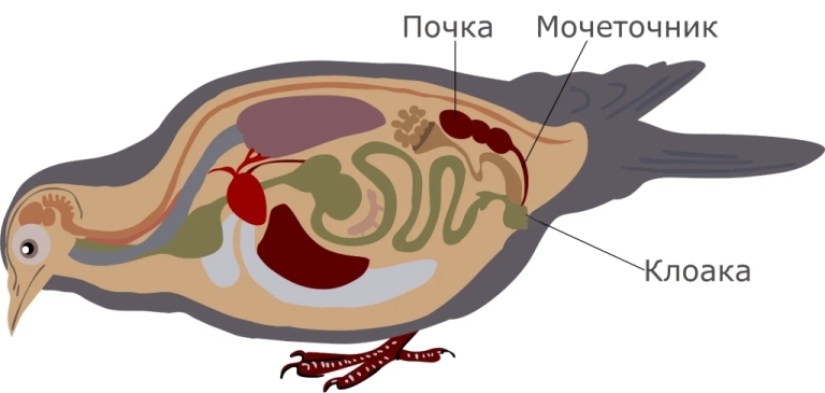 The cloaca is a universal opening that is responsible for excretion and reproductive function. The reproductive organs, intestines, and ureters come out of it. Birds do not have a bladder, and urine enters the cloaca directly from the kidneys. The cloaca is not only a feature of birds. It was found in dinosaurs, and is found in reptiles, amphibians, some fish, and even platypuses. From an evolutionary point of view, this method of excreting waste is an adaptation to flight.